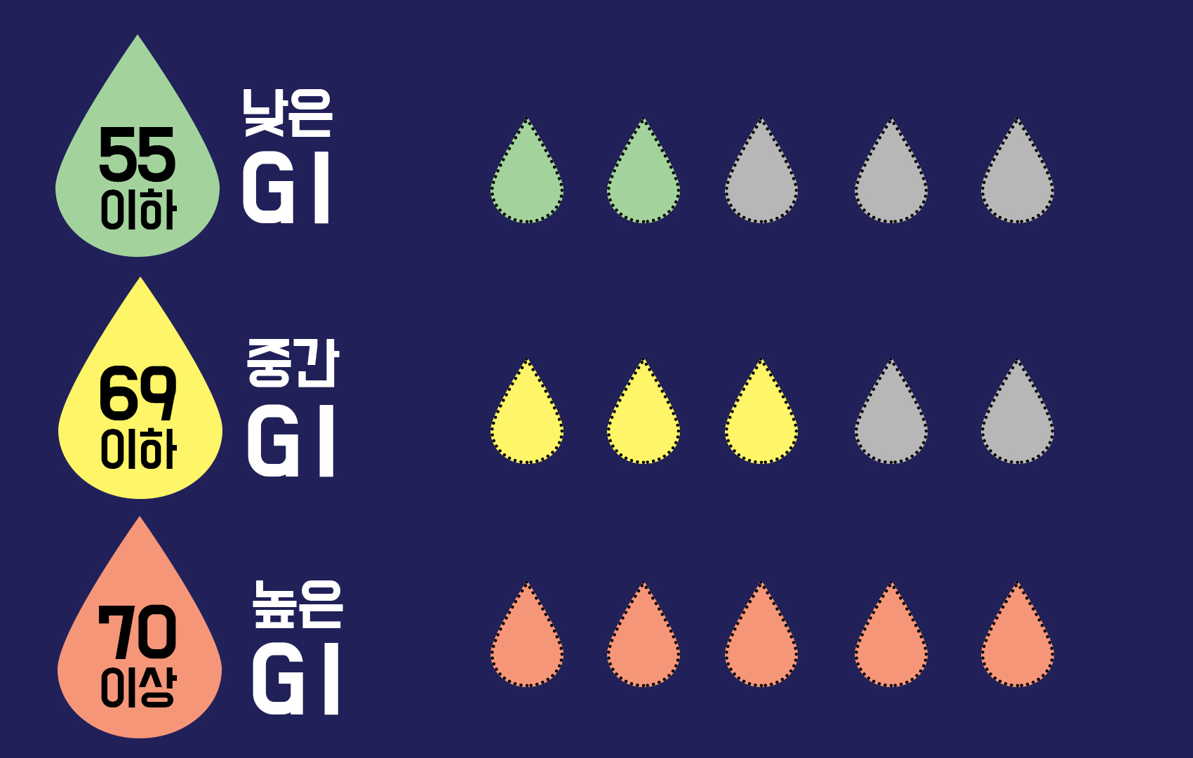 혈당지수는 쉽게 설명해서 본인이 섭취하는 음식으로 인해서 혈당 수치가 얼마나 빨리 상승하는지 나타내는 지표라고 볼 수 있다. 1980년대 초 캐나다 교수인 데이비드 젠킨스 박사에 의해 만들어졌으며 총 세등급으로 분류가 된다. 낮은 GI지수는 55 이하, 중간 GI지수는 56-69, 높은 GI 지수는 70 이상이다.