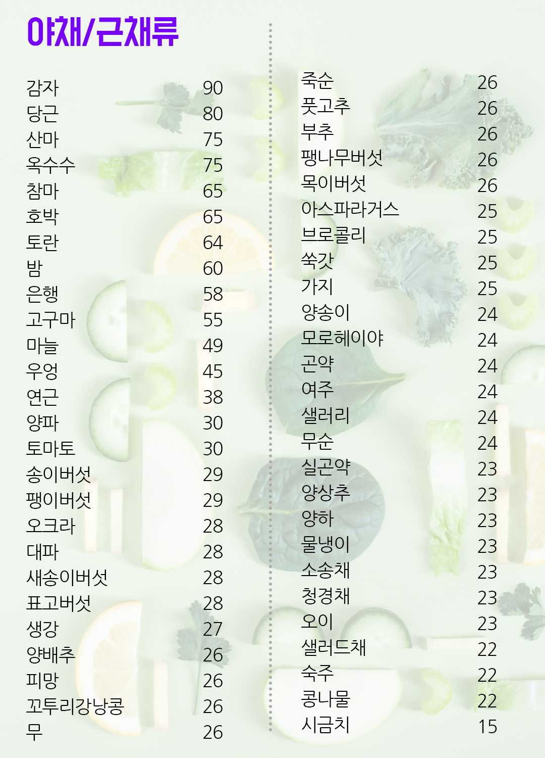 야채는 당근, 브로콜리, 콜리플라워, 토마토, 호박, 고구마, 감자, 옥수수 등이 낮은 GI지수이다.