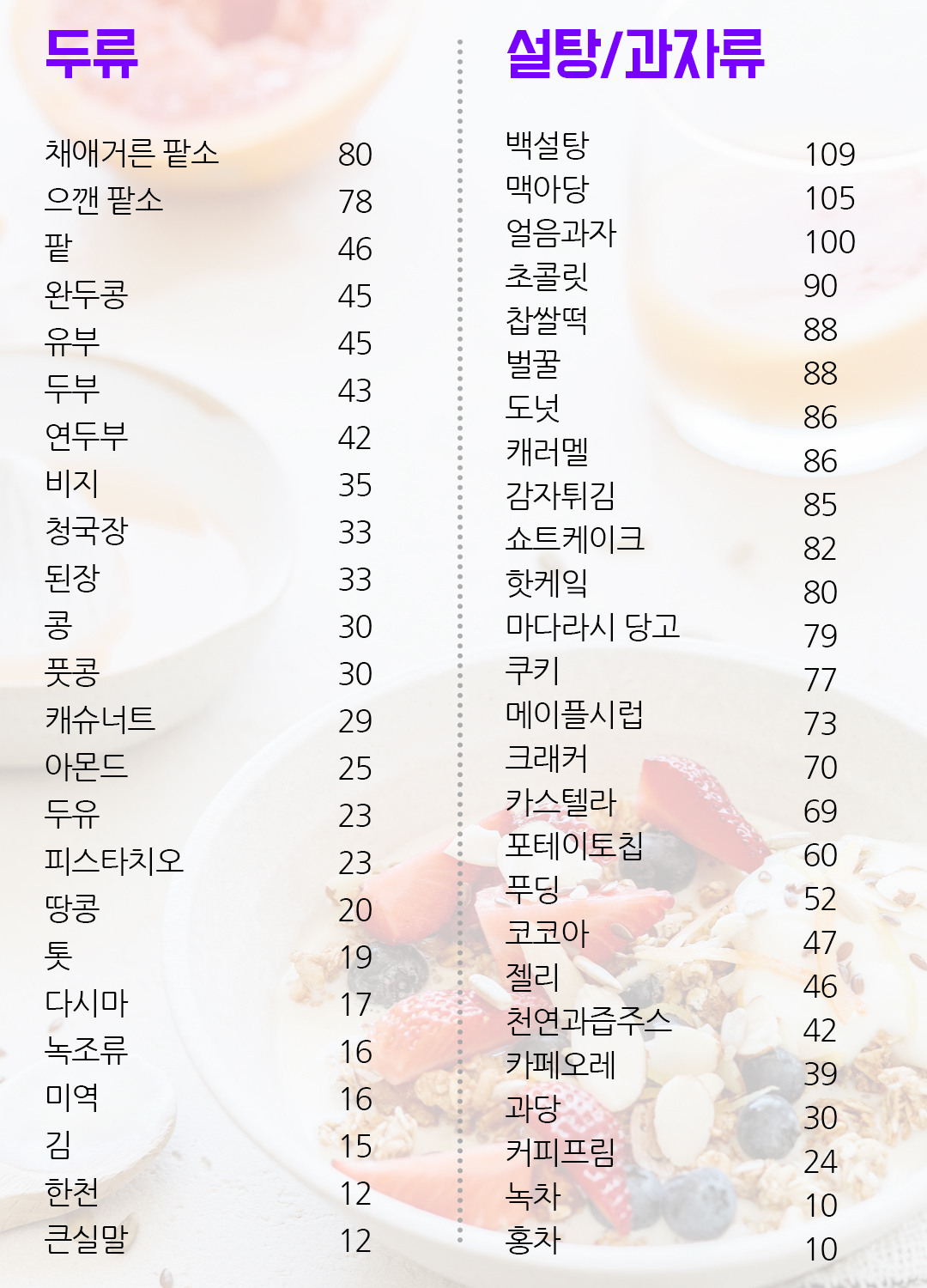 소금이나 설탕으로 정제하지 않은 견과류, 과일 조금, 유기농 과자, 딸기, 포도, 플레인 요거트 등이 있다.