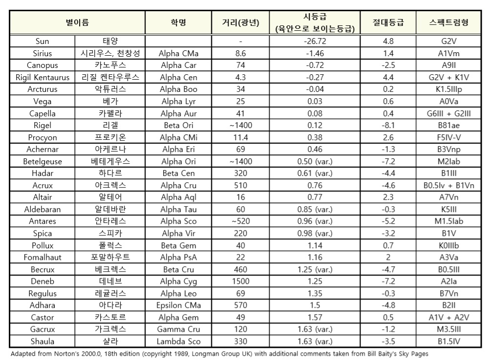 과연 밝은 별들은 어떤 별들이 있을까요? 별들의 절대등급과 겉보기 등급도 궁금하죠? 다음의 리스트를 확인해보시기 바랍니다.